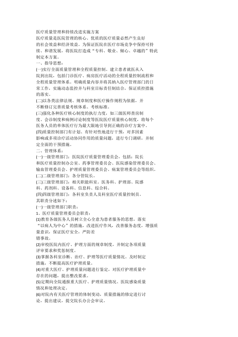 医疗质量管理和持续改进实施方案