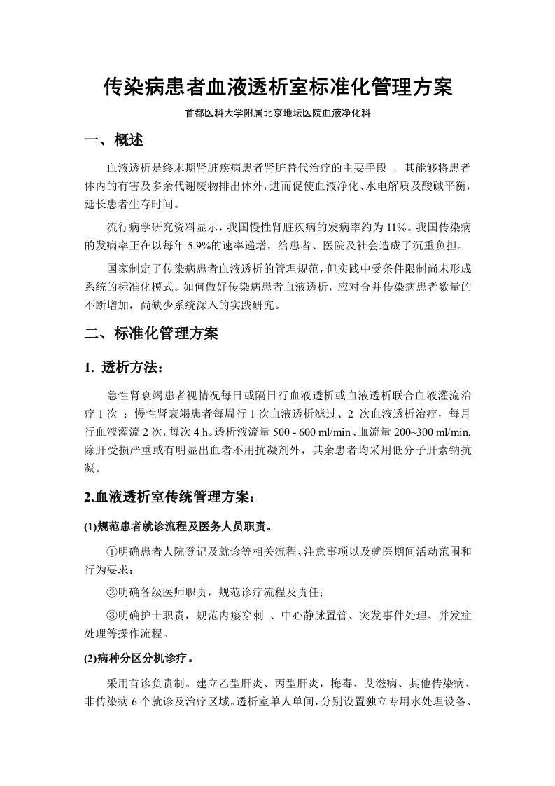 传染病患者血液透析室标准化管理方案(首都医科大学附属北京地坛医院血液净化科)